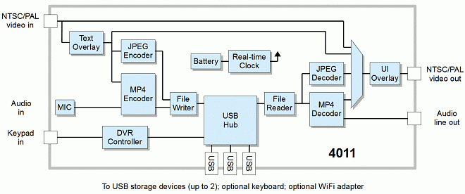 Model 4011 is a compact digital video recorder (DVR) designed for embedded OEM applications. It records audio and video (A/V) to USB storage media and can capture JPEG images on-the-fly without interrupting recording. Its A/V outputs allow live video, recorded A/V or JPEG snapshots to be displayed on an external monitor. Date and time are maintained by a real-time clock with battery backup. To implement a complete embedded DVR simply connect power, your own custom keypad and a USB storage device.