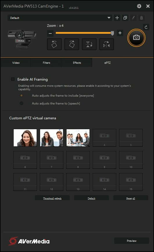Keep meetings and livestreams engaging with our free CamEngine app. Utilize our enterprise-grade features such as ePTZ, auto framing, and AI-powered speaker tracking to zoom in and focus on whoever is speaking while perfectly fitting everyone into the frame. Turn on AI-powered noise reduction so the PW513's built-in omnidirectional stereo microphones reduce ambient noise for lifelike audio.
