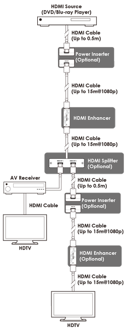 • Supported HDMI cable distance: 15 meters (input and output)
