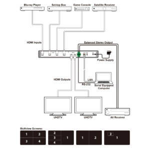 This 4 by 2 Multiviewer is a high performance HDMI switch with integrated scaling and multi-windowing technology. It is an ideal solution for monitoring or displaying multiple sources simultaneously for use in control rooms, conference rooms or classrooms. Video resolutions up to 4K@60Hz and LPCM audio up to 7.1 channels at 192kHz are supported on both input and output and this unit is fully compatible with the HDCP 1.x and 2.2 standards.