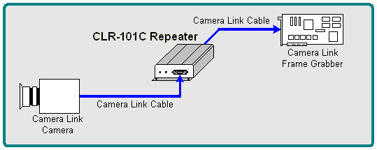 The value-priced CLR-101C Camera Link Repeater is an economical approach to increasing separation between camera and fame grabber. One Camera Link cable connects the camera to the repeater, and a second cable connects the repeater to the frame grabber. This solution provides a 20 meter reach between camera and frame grabber using a pair of standard 10m Camera Link cables. Several repeaters and cables may be cascaded to support greater distances.