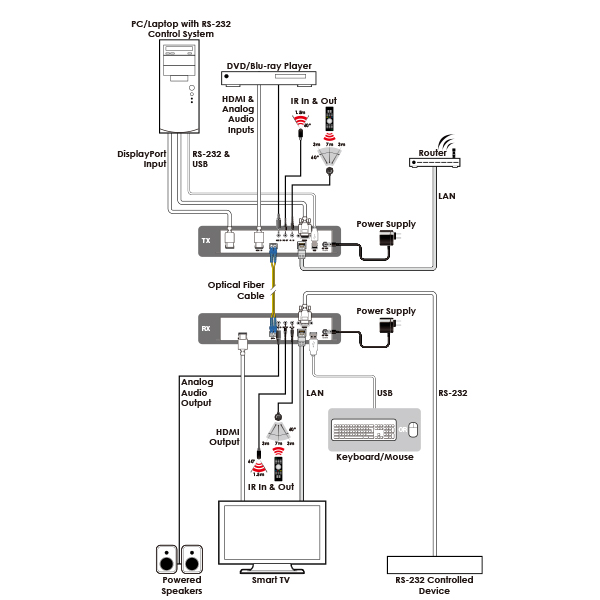 When combined with the optional control center or control software, the functionality of the extenders expands exponentially. Multiple Transmitters and Receivers may be combined with one or more 10Gb fi ber Ethernet switch and the units can be used together to form a distributed video matrix, a multiviewer system, or a video wall system adding to their fl exibility in large event installations.