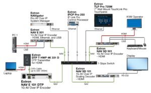 The NAV E 101 DTP is the industry’s first encoder to bridge DTP Systems with NAV Pro AV over IP. It accepts an input signal from any DTP System transmitter and streams ultra-low latency, high-quality content over standard Gigabit Ethernet networks. Extron’s patented PURE3® codec delivers groundbreaking performance with high quality video at resolutions up to 4K @ 60 Hz with 4:4:4 chroma sampling and ultra-low latency. The NAV E 101 DTP is fully compatible with NAV® 1 and 10 Gigabit Ethernet decoders, increasing range and scalability for large deployments. Support for embedded digital HDMI and AES67 audio over IP facilitates flexible integration with DMP Plus DSPs or other IP-enabled audio components. The NAV E 101 DTP is purpose-built to support secure, demanding professional AV applications.