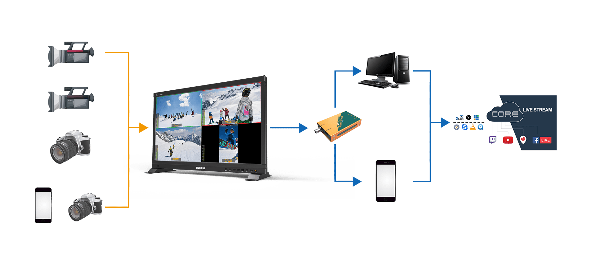 Supports up to 4 live video signals, that can use HDMI or SDI outputs for program video. All the live events